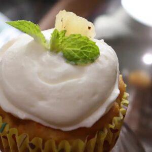 A healthy muffin with fresh tropical fruit and grated carrots made by with Sugarlyte