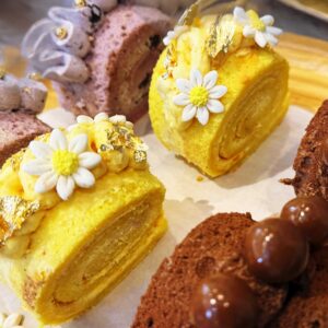 After taking out your cake from the oven, invert it onto a clean, slightly dampened kitchen towel and peel off the parchment paper. Gently roll up your cake and hold it in place so that it doesn't unravel. A rolling pin is perfect for this. Be sure not to squeeze the cake or roll it up too tightly as this can cause cracks to form.